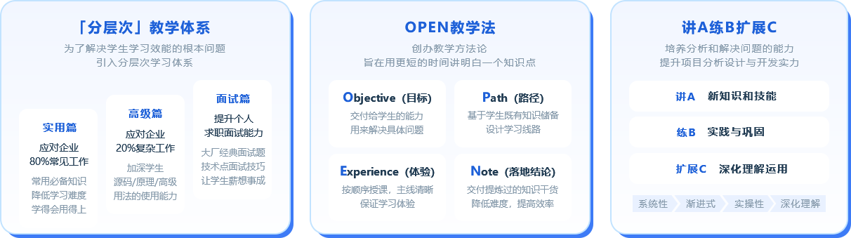 为了能让学生取得更好的学习效果,通过标准化的教学实施(授课)流程体系,能够全程掌控老师的教学过程,准确获取学生的反馈,及时改进提升教学质量